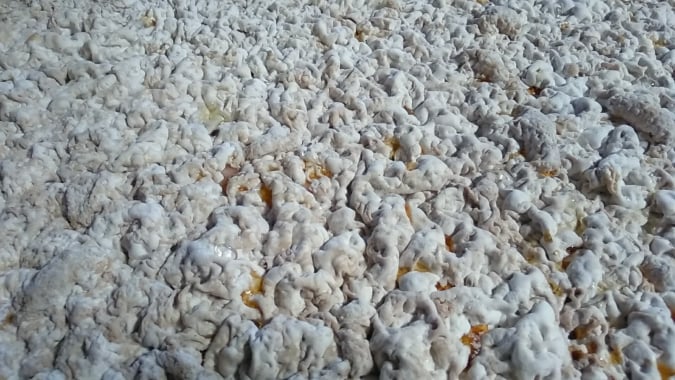 ฝ้าสีขาว มีความละเอียดสวยงาม บ่งชี้ว่ากระบวนการหมักยังทำงานได้ดี และจุลินทรีย์ยังมีชีวิตอยู่